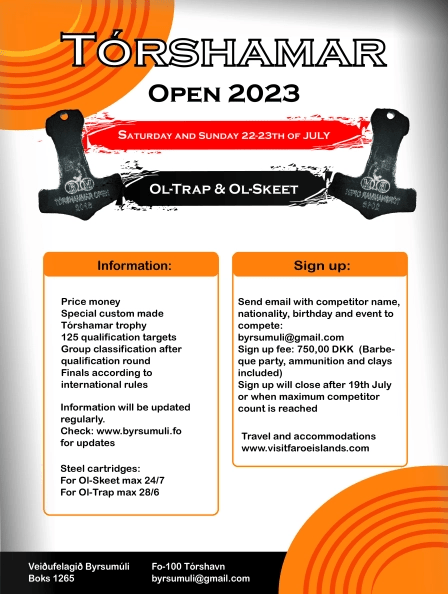 Skotin verða 3 umfør leygardag og tvey umfør sunnudag umframt meistarafinala og A-finala í báðum kappingargreinum. Byrjað verður kl. 9 leygardagin og kl. 13 sunnudagin. Úrslit v.m. frá kappingini síggjast her: https://docs.google.com/spreadsheets/d/1e6ujYrqOlW9t4hecYqJjnkDARsWikRVQaPiKHpFwQk8/edit?usp=sharing